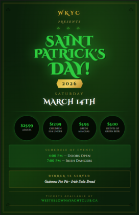 St. Patrick’s Day Calendar Add to Calendar Add to Timely Calendar Add to Google Add to Outlook Add to Apple Calendar Add to other calendar Export to XML When: March 14, 2026 @ 4:00 pm – 10:00 pm 2026-03-14T16:00:00-07:00 2026-03-14T22:00:00-07:00 NOTE: If you wish to use a credit card for payment, please call the office during business hours at 250-768-5472. Please do not leave a voicemail for a call back. Please enter the name of each member requesting a reservation: What is your member number(s)? How many adults in your party? How many children (under 10 years old)in your party? Your email address: I/we would like a vegetarian meal(s) Yes If requesting a veggie option for adults, how many do you need? If requesting a veggie option for children, how many do you need? I/we would like a gluten-free meal(s) Yes If requesting a gluten-free option for adults, how many do you need? If requesting a gluten-free option for children, how many do you need? How would you like to pay? Please charge my house account using my member number providedI will call the office to charge it to my credit card Post navigation Rib’n BluesRedneck Yacht Club Country Night