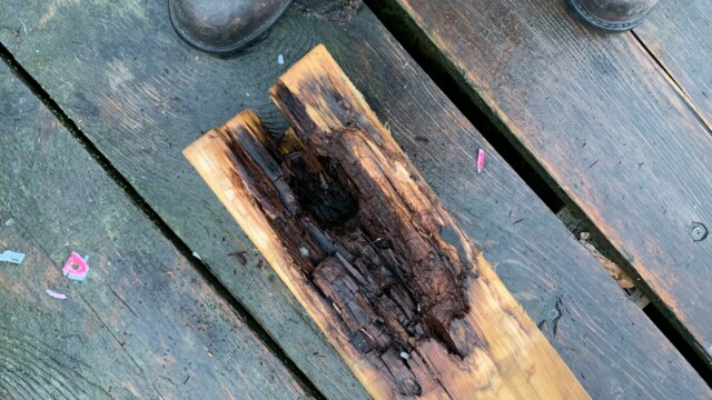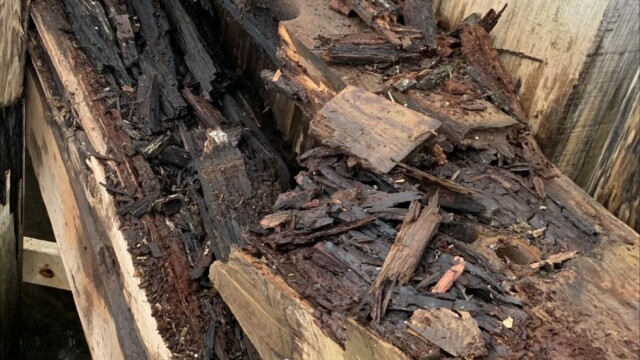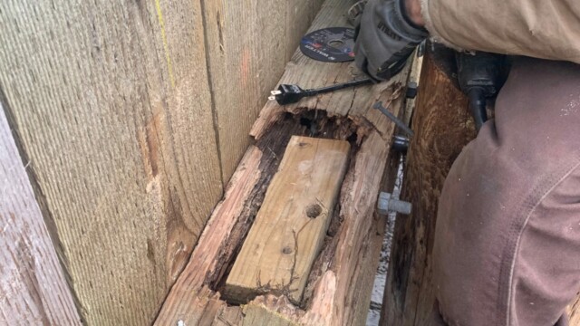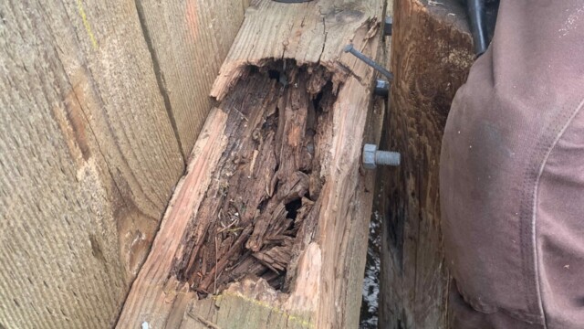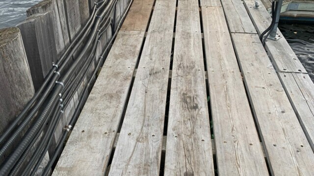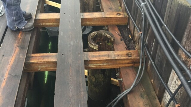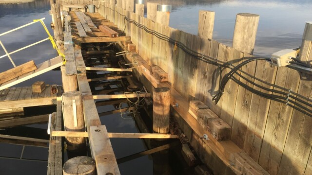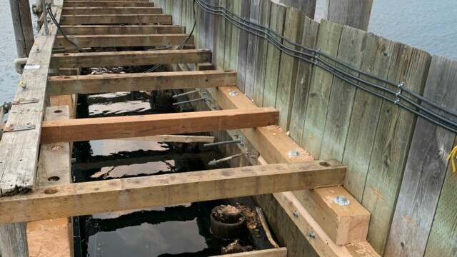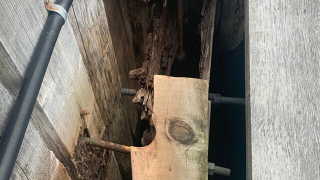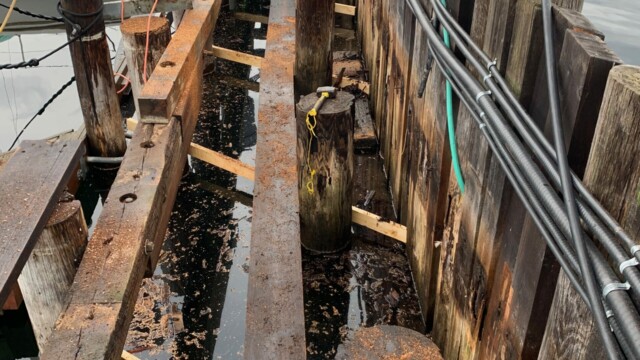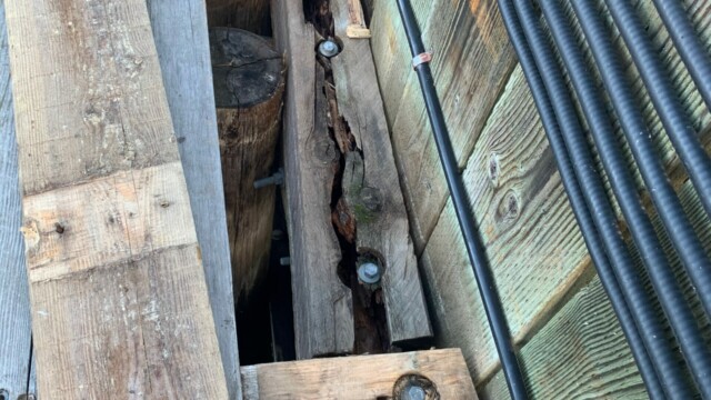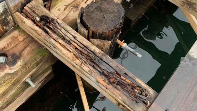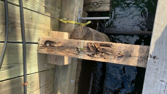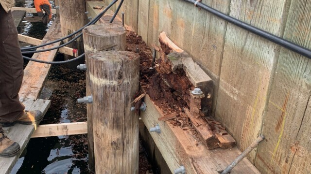 On G dock, 3 rotten external stringers were replaced. The rotted stringers, which are quite massive timbers, were significantly decayed – meaning they no longer performed the protective structural role required.